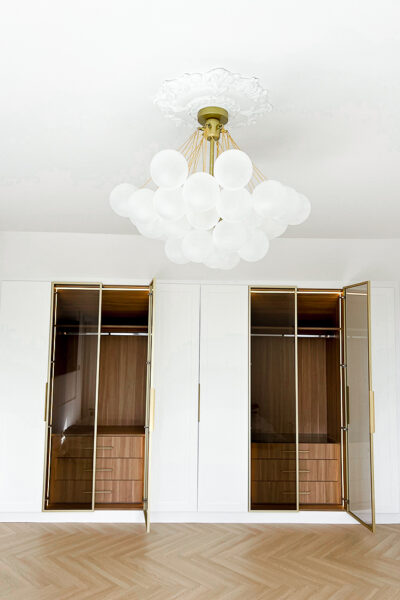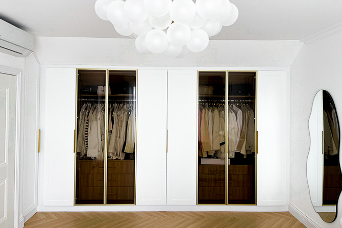 One of the main highlights of this renovation is the bespoke wardrobe that fills the entire wall. Every inch has been used efficiently, creating a flawless built in look that blends perfectly with the rest of the room. Through the main wardrobe door there is a hidden section with plenty of storage shelves and drawers. Some of the doors were finished with glass panels and golden handles, adding a touch of luxury and lightness to the space.